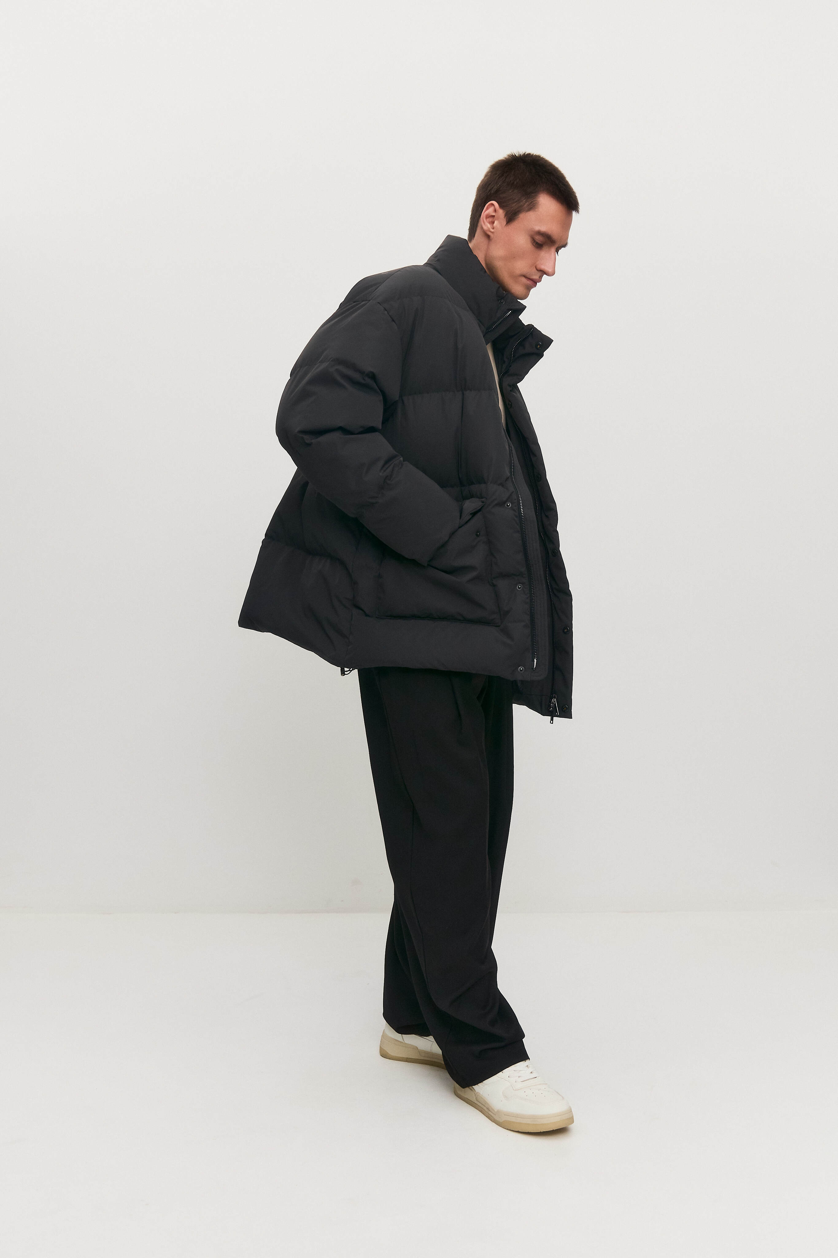 Удлиненный пуховик без капюшона графитового цвета из мембранной ткани.